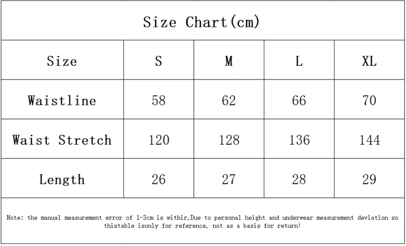 XL: cintura 70 cm, cintura elástica 144 cm, longitud 29 cm.
