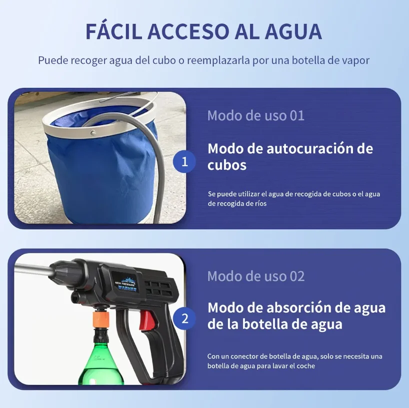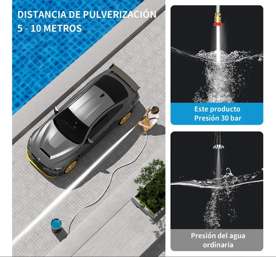 Es cierto que la presión de nuestra pistola de descarga no es comparable con la hidrolavadoras conectada a corriente continua, pero en comparación con otras pistolas de descarga del MercadoLibre que usan baterías, podemos decir que la hidrolavadora portátil de limpieza es la mejor. El agua se puede rociar fácilmente a una distancia de 5 a 10 metros. Puede satisfacerle para limpiar la suciedad persistente de automóviles, bicicletas, acondicionadores de aire, pisos, botes, jardines, piscinas, ventanas, etc. También se puede usar para tareas agrícolas al aire libre, como regar flores y rociar plaguicidas.