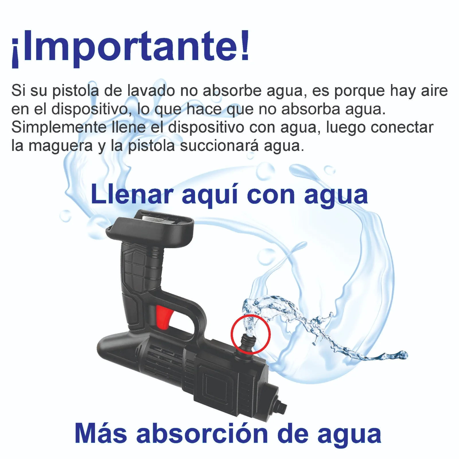 Atención: Si su pistola de lavado no absorbe agua, es porque hay aireen el dispositivo, lo que hace que no absorba agua. Simplemente llene el dispositivo con agua, luego conectar.la manguera y la pistola de lavado de autos succionará agua.